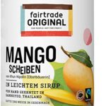 Dosen Mango – natürlich und fair trade. Darüber hinaus ist diese Dosenmango von Fairtrade Original zertifiziert, was bedeutet, dass sie aus verantwortungsvollem und ethischem Anbau stammt. Damit wird sichergestellt, dass die Arbeiter, die diese Mangos anbauen, faire Löhne und sichere Arbeitsbedingungen erhalten, damit sie ihre Familien ernähren können.