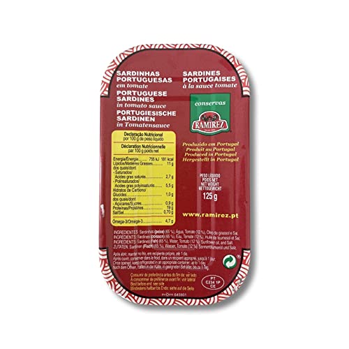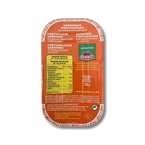 Zutaten: Sardinen (FISCH), Olivenöl und Salz; Allergene: FISCH; Hersteller: Ramirez & Sons SA Cª (Ramirez & Cª Filhos SA), R. do Passadouro 135, Lavra, Portugal;